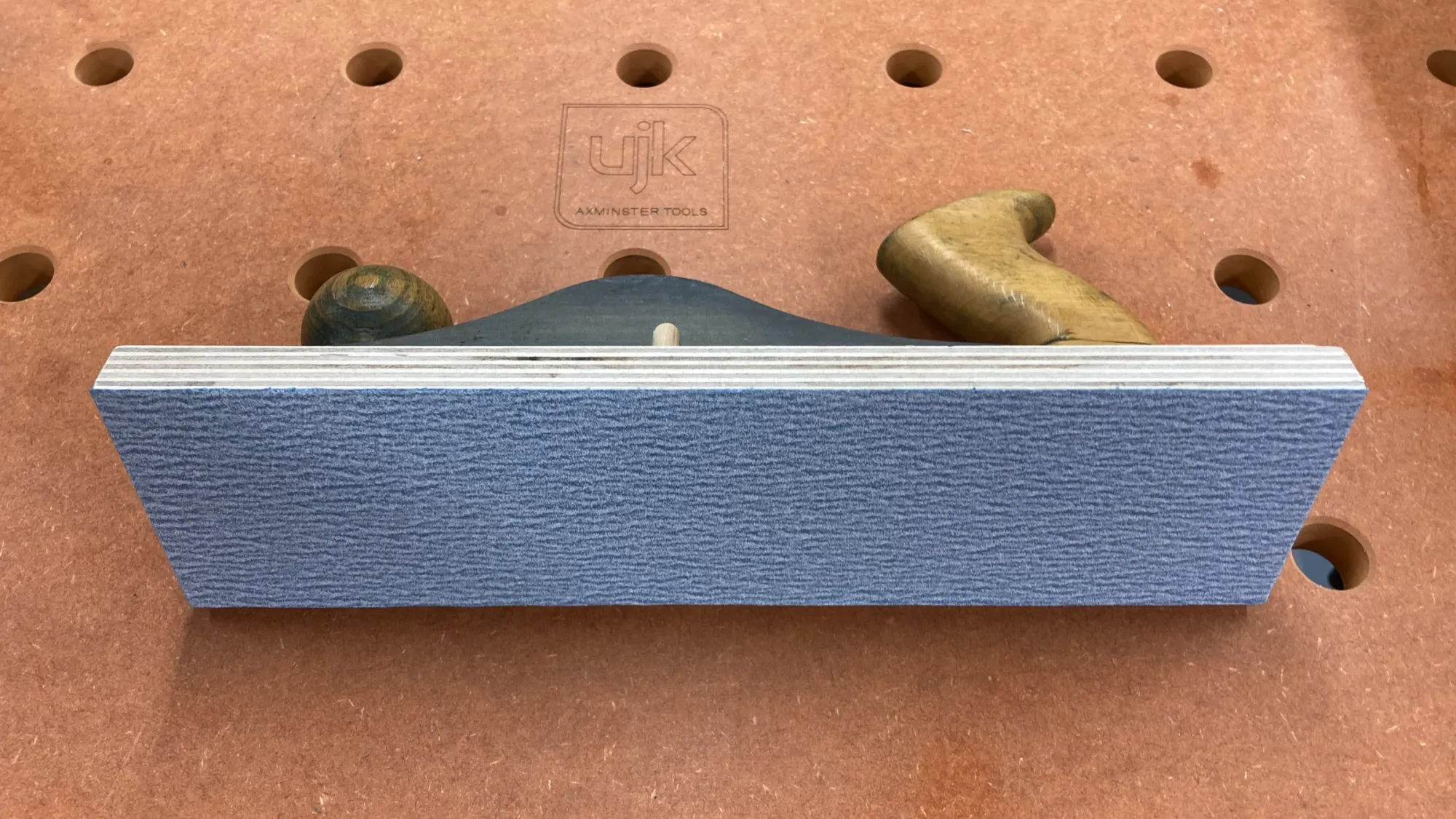 I sanded my first two electric guitar bodies with a block that consisted of a piece of 5/8” birch plywood glued to a half-thickness of 2×4 offcut. The plywood provided a reliably flat substrate for the sandpaper and the 2x4 gave me something to grip. This was a simple solution and it worked well. The problem was that it wasn’t very comfortable to use. I had to take frequent breaks to keep my hand from getting tired. There was also something about the technique of using it that seemed to encourage bad posture, making matters worse.